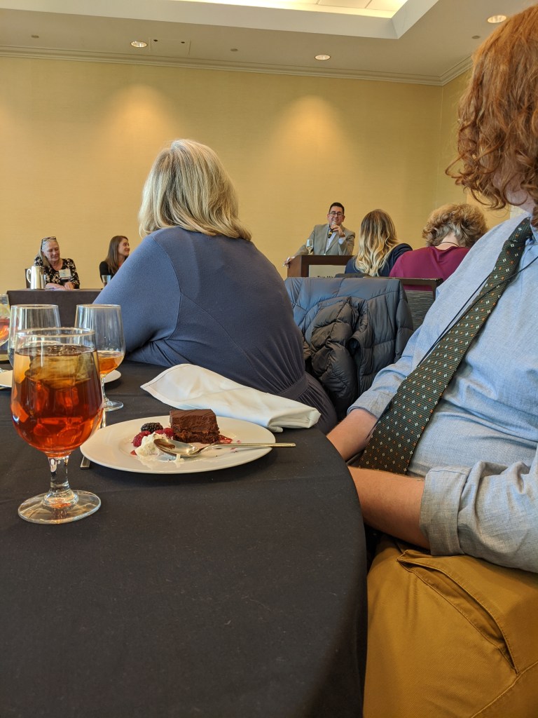 I found this event by signing up through an email sent by the COJO department head. I took the day off to attend with a school excused absence. It was difficult to get the shot because of the crowded room, which made it hard to get a clear shot that encompassed the events. I used perspective to frame the event by taking a photo that first focuses on the food and Jane Dvorak and her mentee in the foreground, while still focusing on the speaker and his fellow panelists.