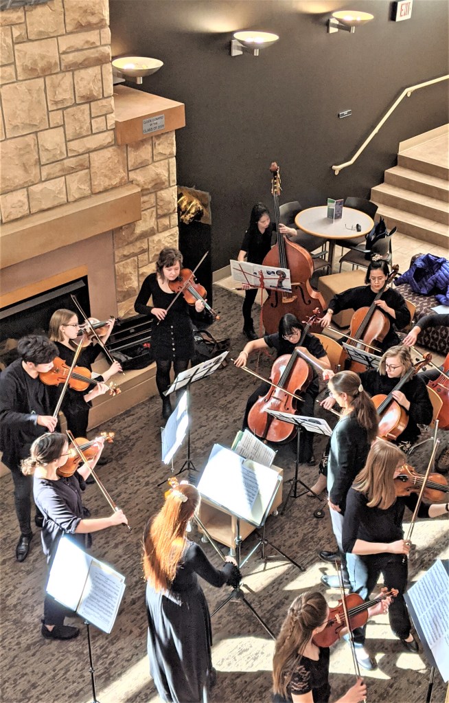 I found this event when I was searching the campus for things to photograph. I heard the music from below and found a good vantage point to take a picture from. This shot was easy to take because I was invested in the performance and had a good vantage point. I used vantage point to take this photo as well as framing. I used a vantage point from overhead and angled myself from behind the violin players to get an interesting perspective.