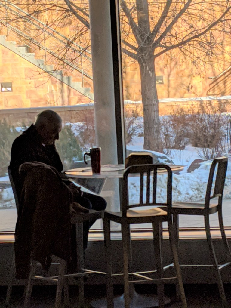 A member of the Laramie community reads his paper while drinking a cup of coffee from The Book and Bean in William Robertson Coe Library.