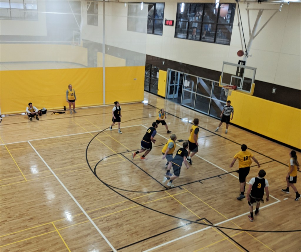 The yellow team makes a quick shot as the brown team sprints to catch a possible rebound during an intramural game at Half Acre on Wednesday.
